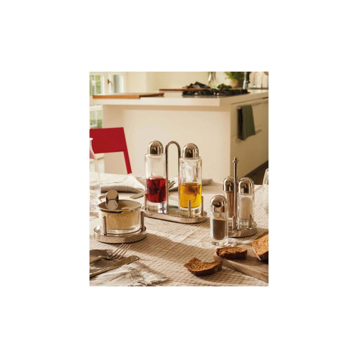 Servizio per olio, aceto, sale e pepe in acciaio inossidabile 18/10 lucido e vetro cristallino.