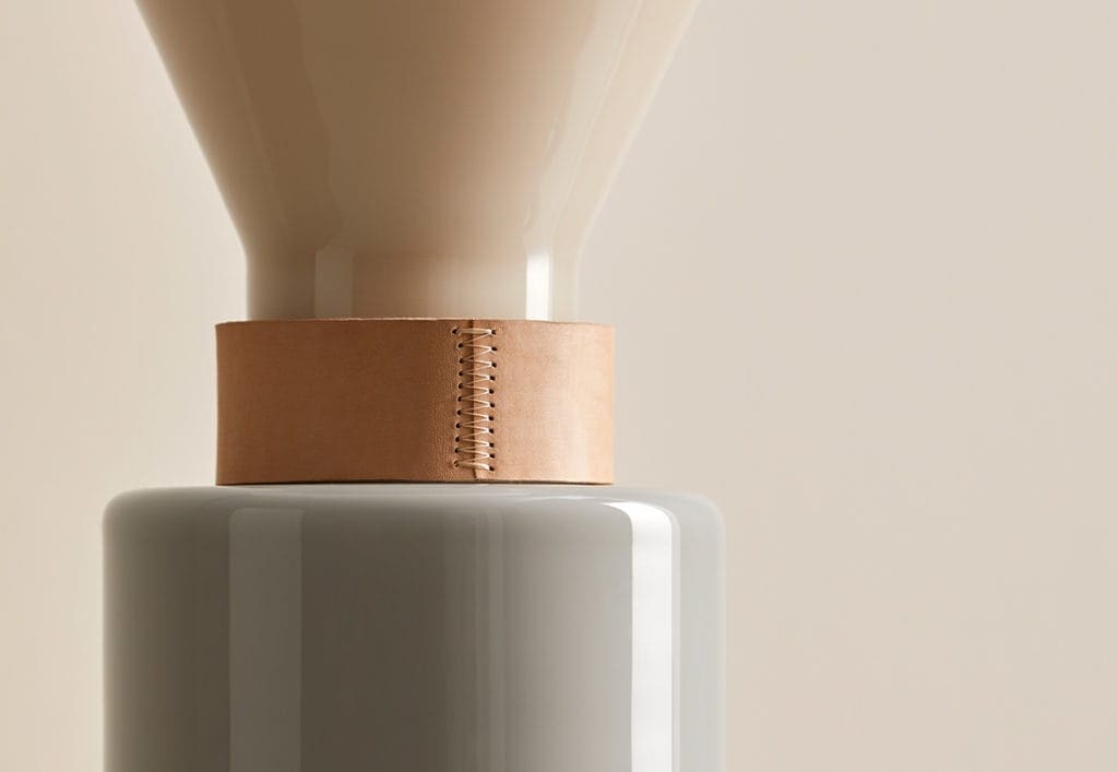 Lampada da tavolo dal design all’avanguardia con base in metallo cromato e un dettaglio in pelle naturale