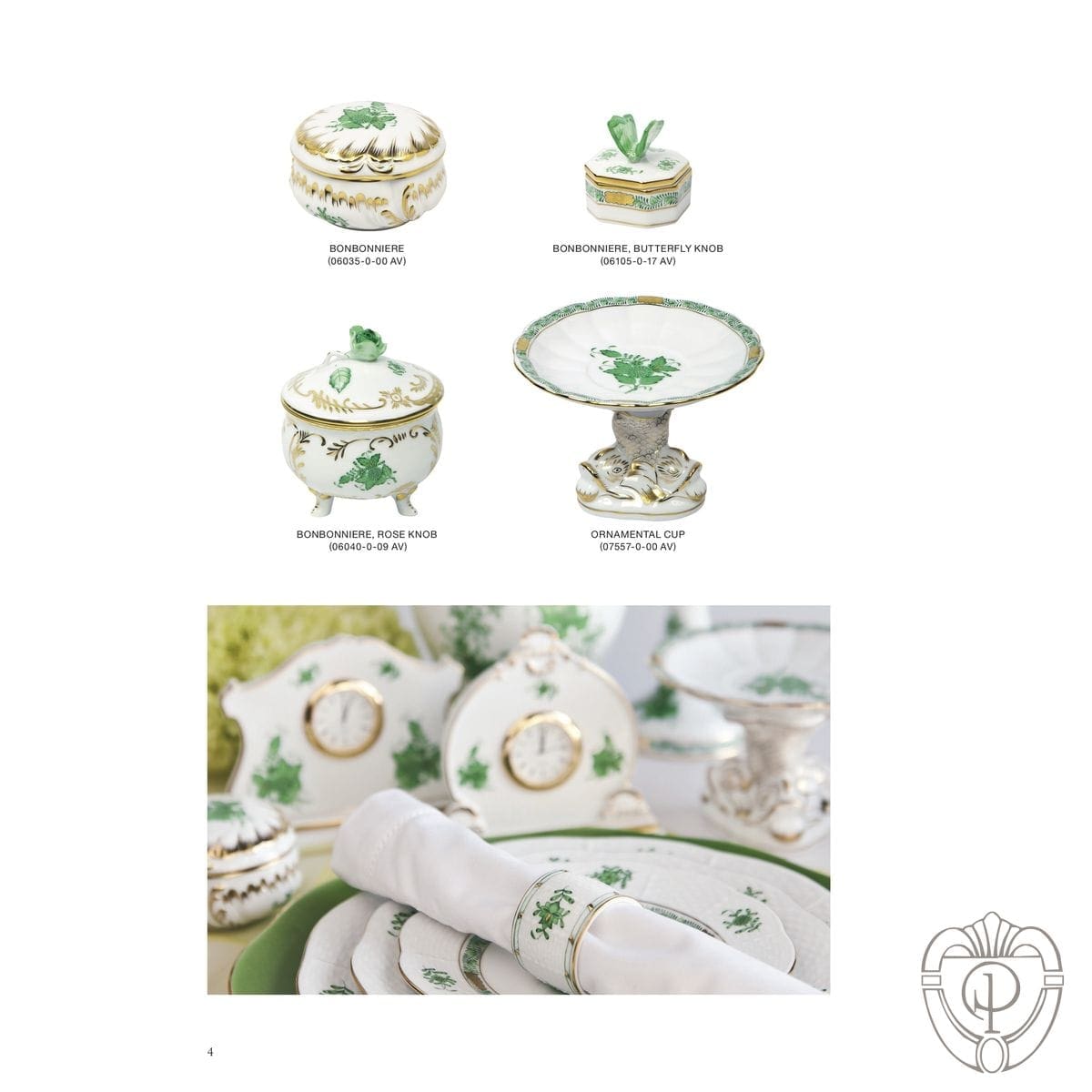 Conosciuto anche con il nome di Chinese Bouquet, il decoro è nato per il Conte Albert Apponyi (1846-1933), un famoso politico e diplomatico ungherese. I fiori stilizzati, dipinti rigorosamente a mano libera dai maestri pittori di Herend possono essere scelti tra diverse combinazioni cromatiche: viola, fucsia reale, verde, arancione, blu, giallo, marrone, nero e turchese.