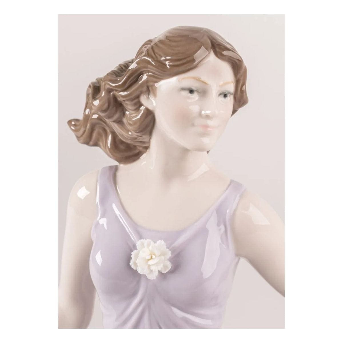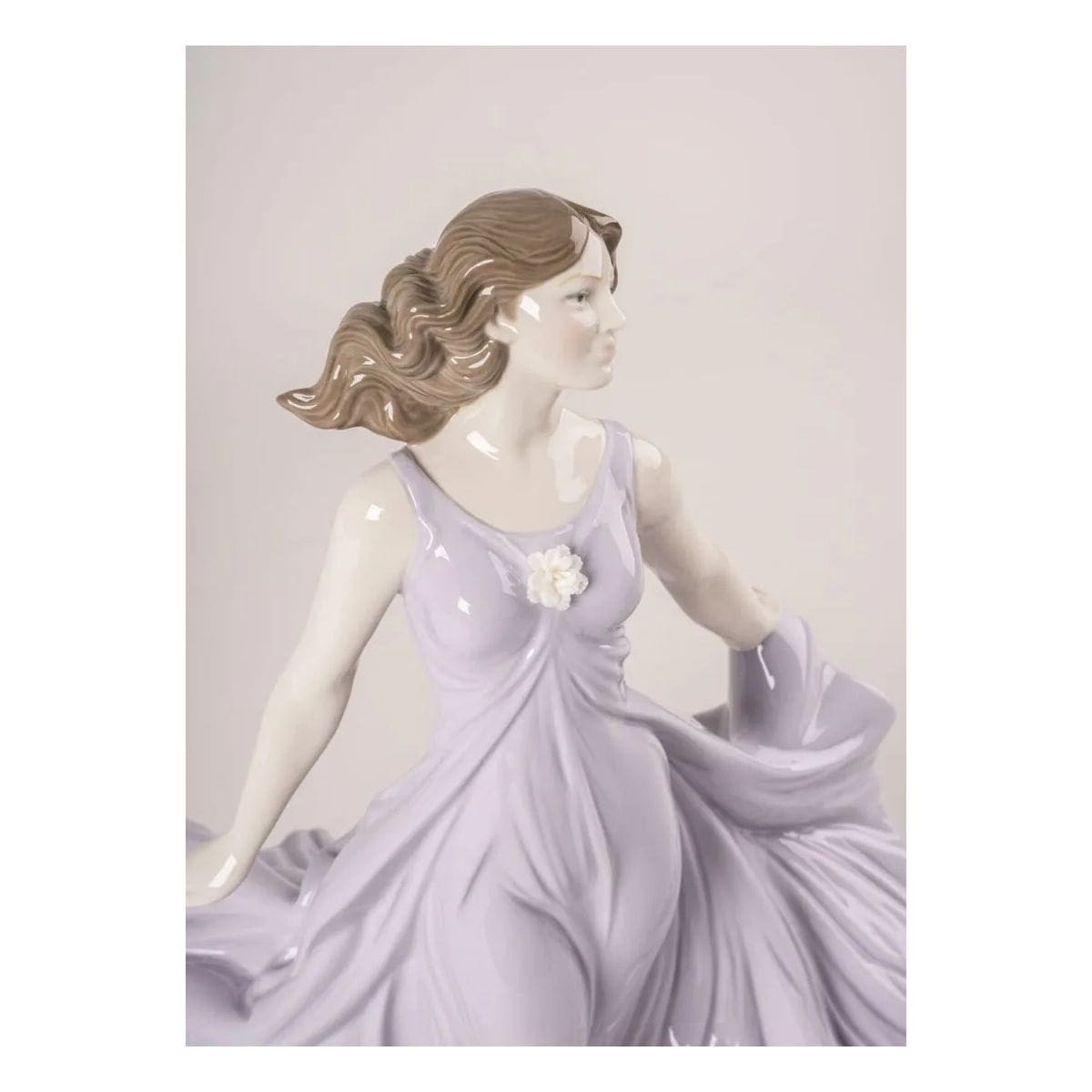 Realizzata in porcellana lucida, la creazione si distingue per la caduta dell’abito, ricca di sfumature e ondulazioni che catturano la luce da ogni angolazione. Sul petto, un garofano dai petali bianchi realizzati a mano in porcellana opaca aggiunge un dettaglio delicato.