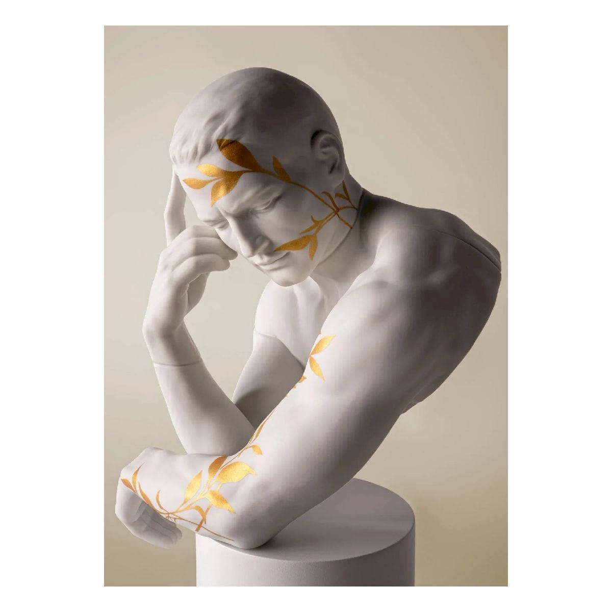 Busto maschile realizzato in porcellana bianca che mostra un uomo in atteggiamento riflessivo. La decorazione con lustro dorato assume un ruolo centrale. Le foglie che scorrono lungo il viso e le braccia si dispiegano come un segno luminoso, una presenza sottile che evoca il modo in cui la luce attraversa la vegetazione e proietta forme mutevoli sulla pelle.