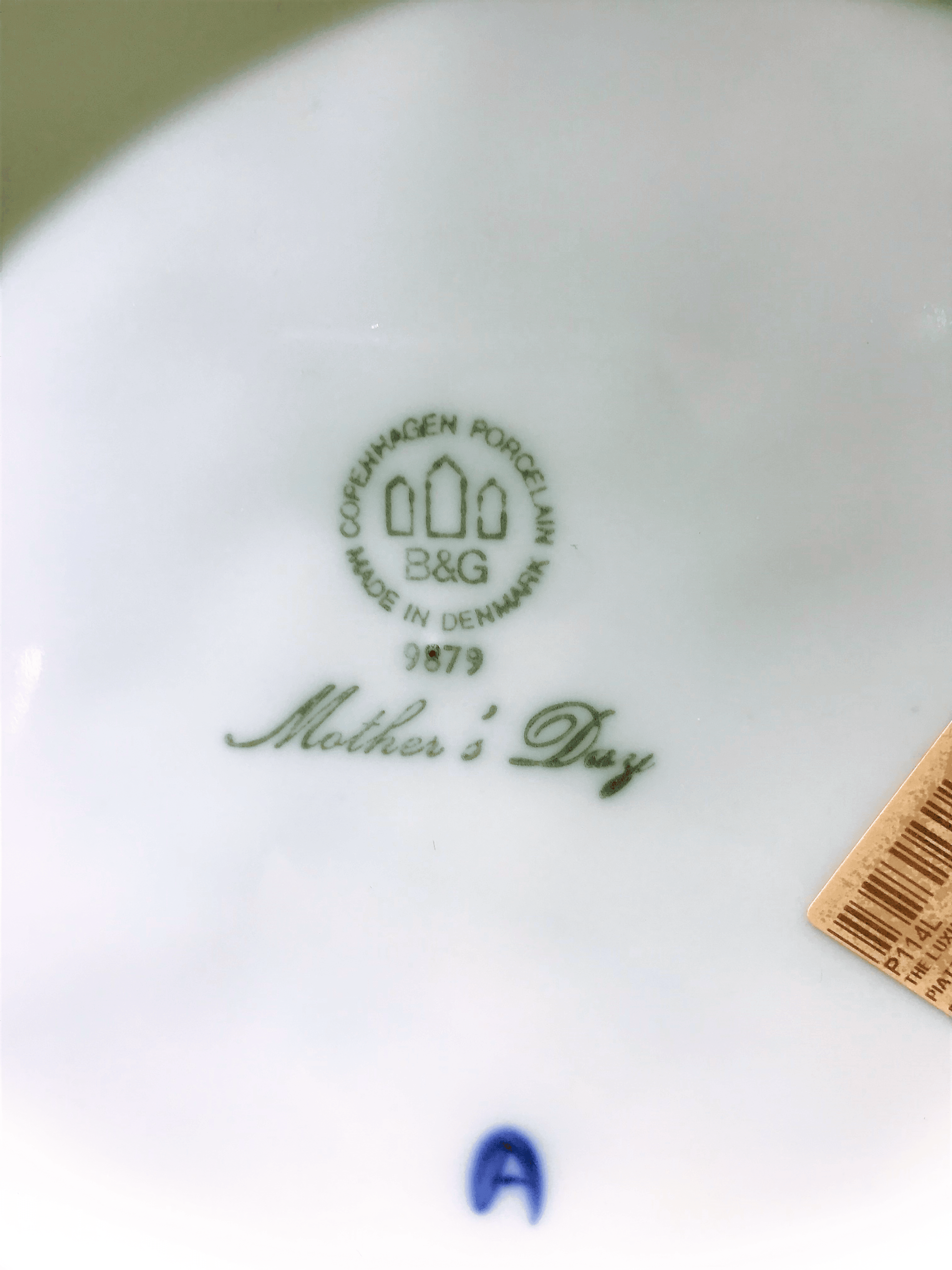 - Proposto come marchio di fabbrica della Royal Danish Porcelain Factory nel 1775 dalla regina vedova Juliane Marie, ogni pezzo di porcellana Royal Copenhagen è immediatamente riconosciuto dalle tre onde blu sul lato inferiore che simboleggiano il suono, la Grande Cintura e la Piccola Cintura – i tre principali corsi d’acqua della Danimarca.A garanzia di autenticità, i piatti recano il marchio originale Royal Copenhagen.