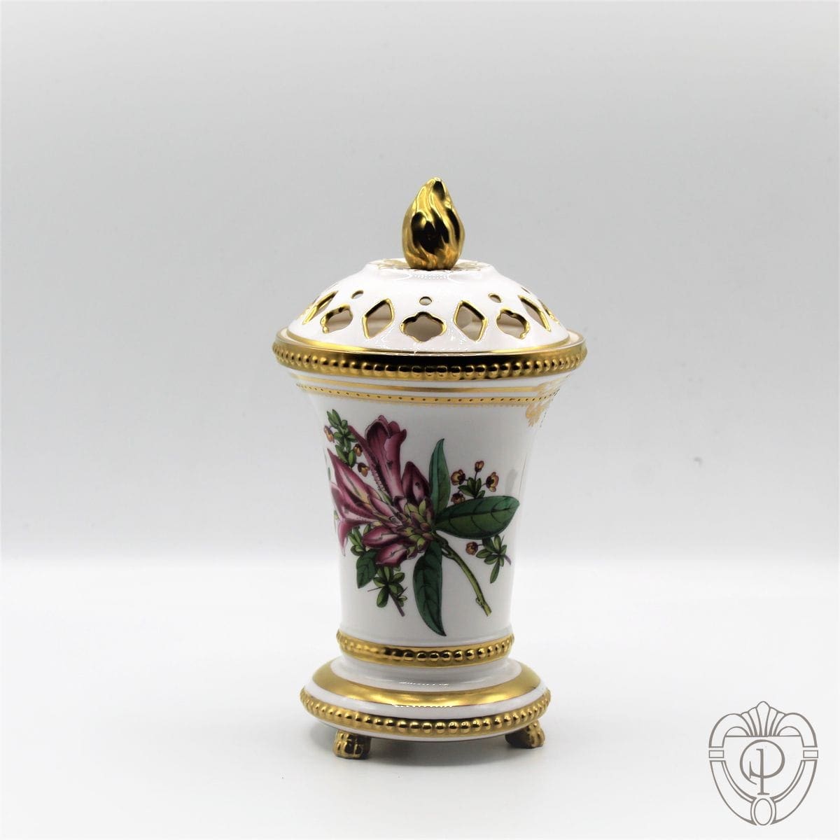Spode pot pourri decoro stafford flowers salvia e rododendro in porcellana bone china. Decoro floreale interamente dipinto a mano con riporti in oro. Doppio coperchio traforato.