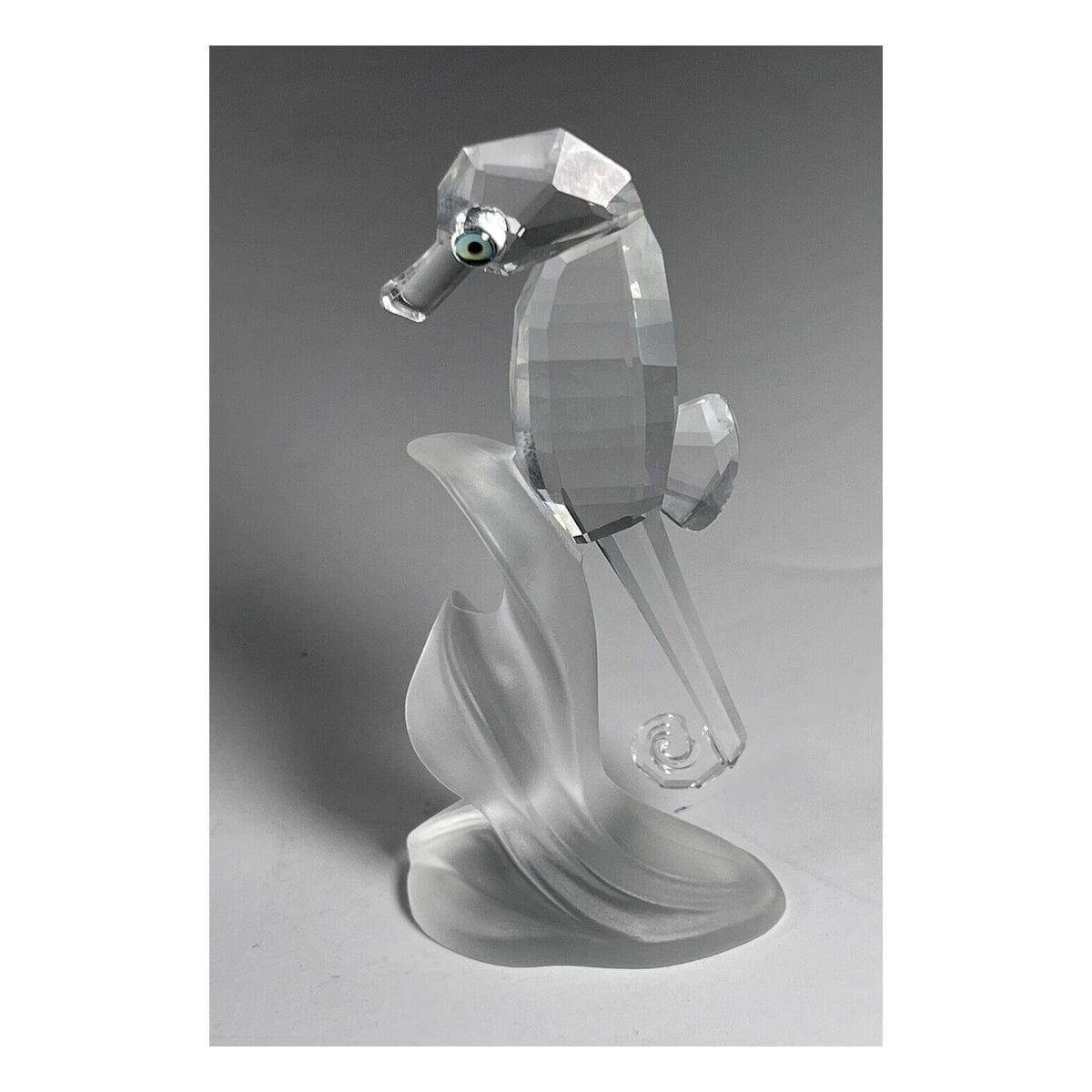 Cavalluccio marino in cristallo trasparente Swarovski attaccato a uno scoglio in cristallo smerigliato.