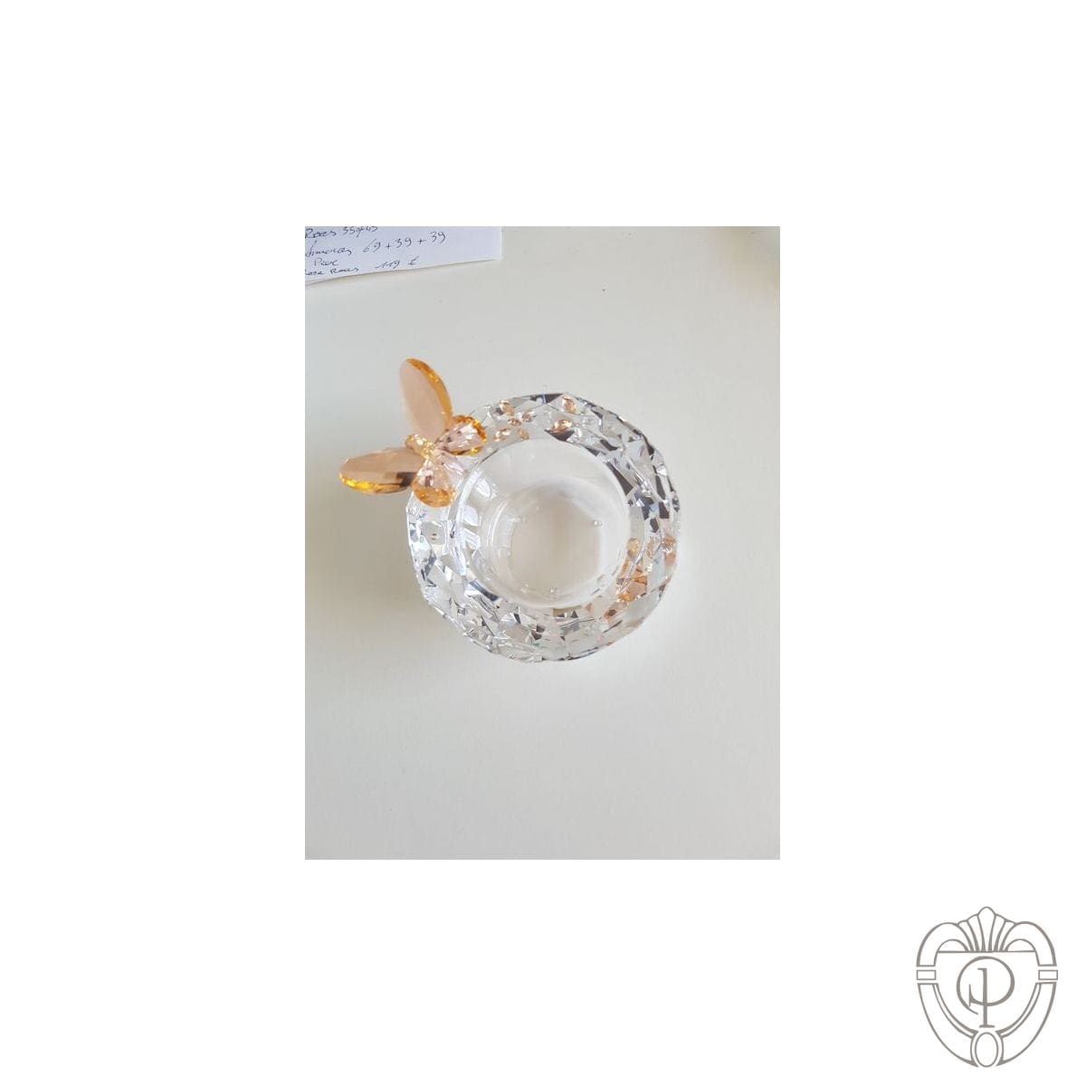 Questa lampada da tè in cristallo Swarovski ritirata dal commercio è realizzata in cristallo trasparente e presenta una farfalla in cristallo color pesca chiaro e applicazioni a farfalla più piccole. La farfalla tea light era disponibile solo nel 2007 come parte della promozione “Primavera e Pasqua”.