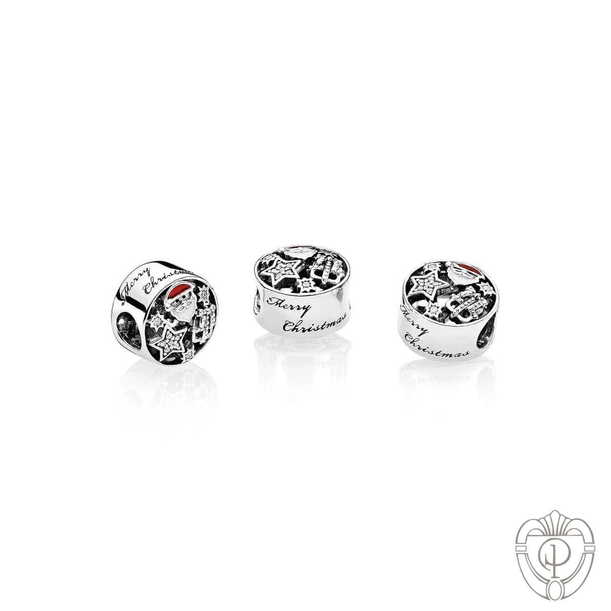Sentiti festa ogni volta che lo desideri con questa scena scintillante e colorata. Questo charm in argento sterling e smalto presenta Babbo Natale, stelle e regali.