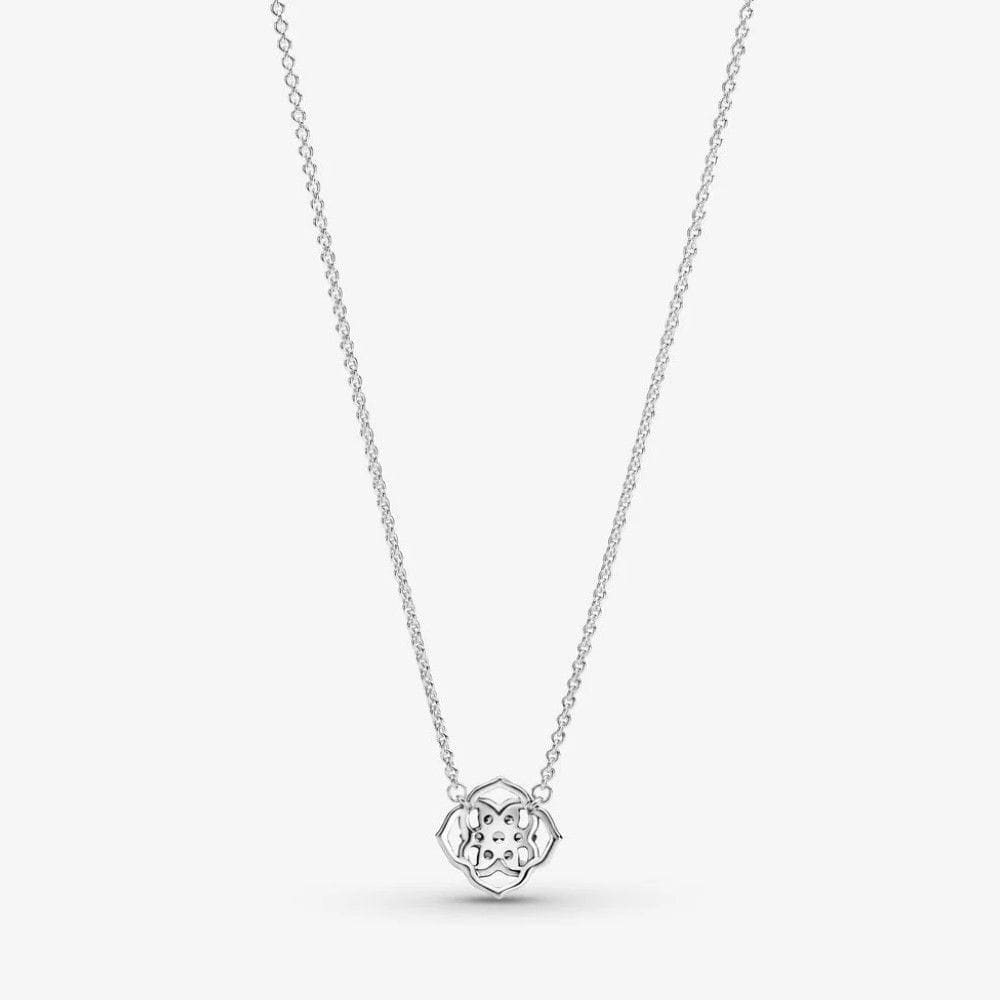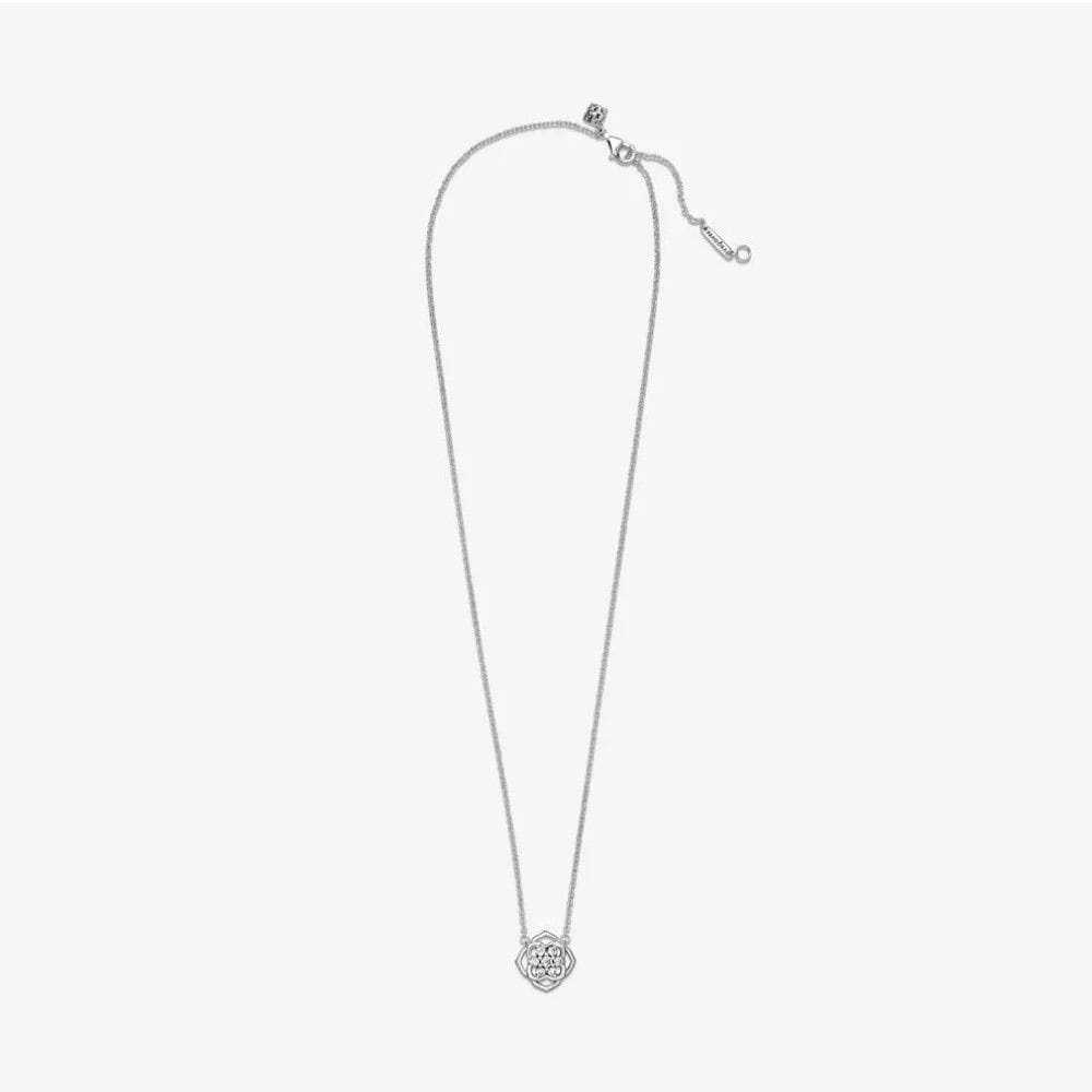Ravviva la tua collezione con il collier Petali di rosa. Rifinito a mano e realizzato in Argento Sterling 925, il gioiello presenta un pendente a forma di rosa con petali posizionati su due livelli diversi. Pietre di zirconia cubica incolori incastonate a forma di fiore decorano il centro del pendente. Un piccolo pendente a forma di rosa all’estremità della catena regolabile e una targhetta con logo Pandora accanto alla chiusura completano il gioiello. Indossa questo collier scenografico con altri gioielli ispirati alle rose per uno stile classico e coordinato.