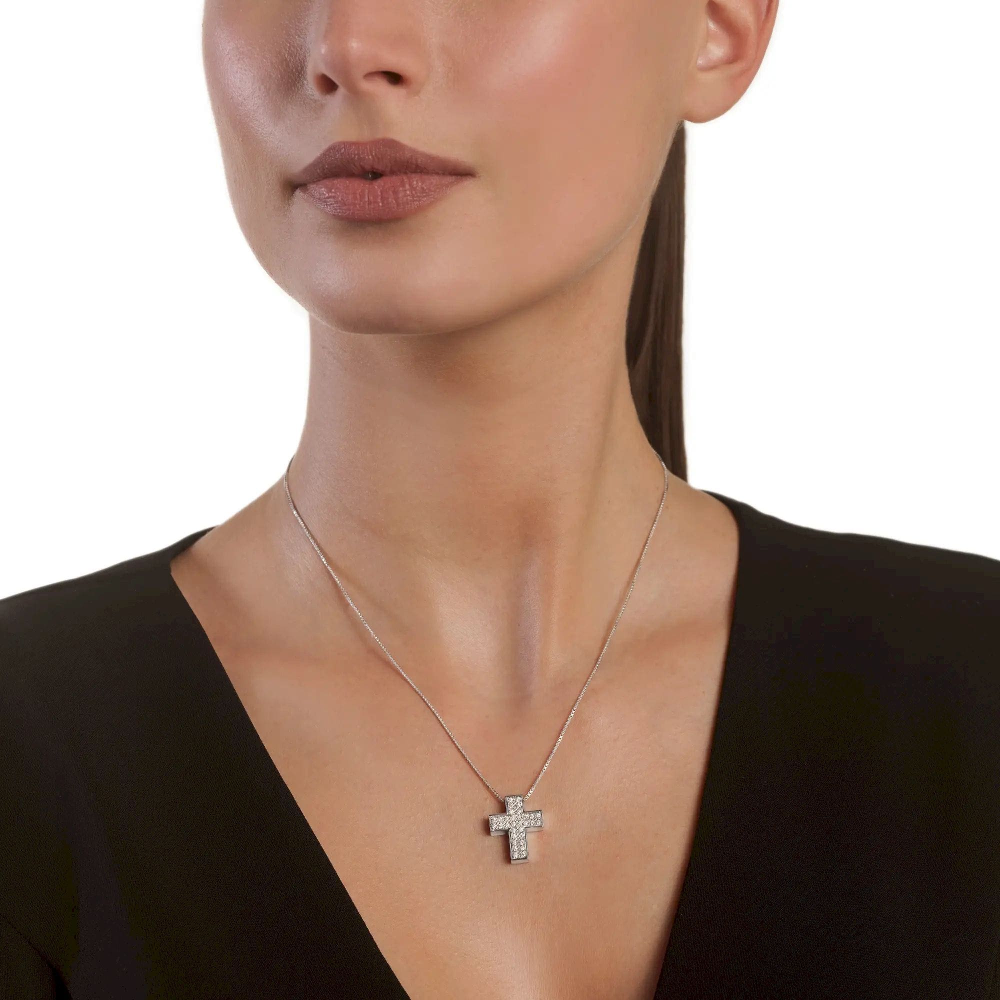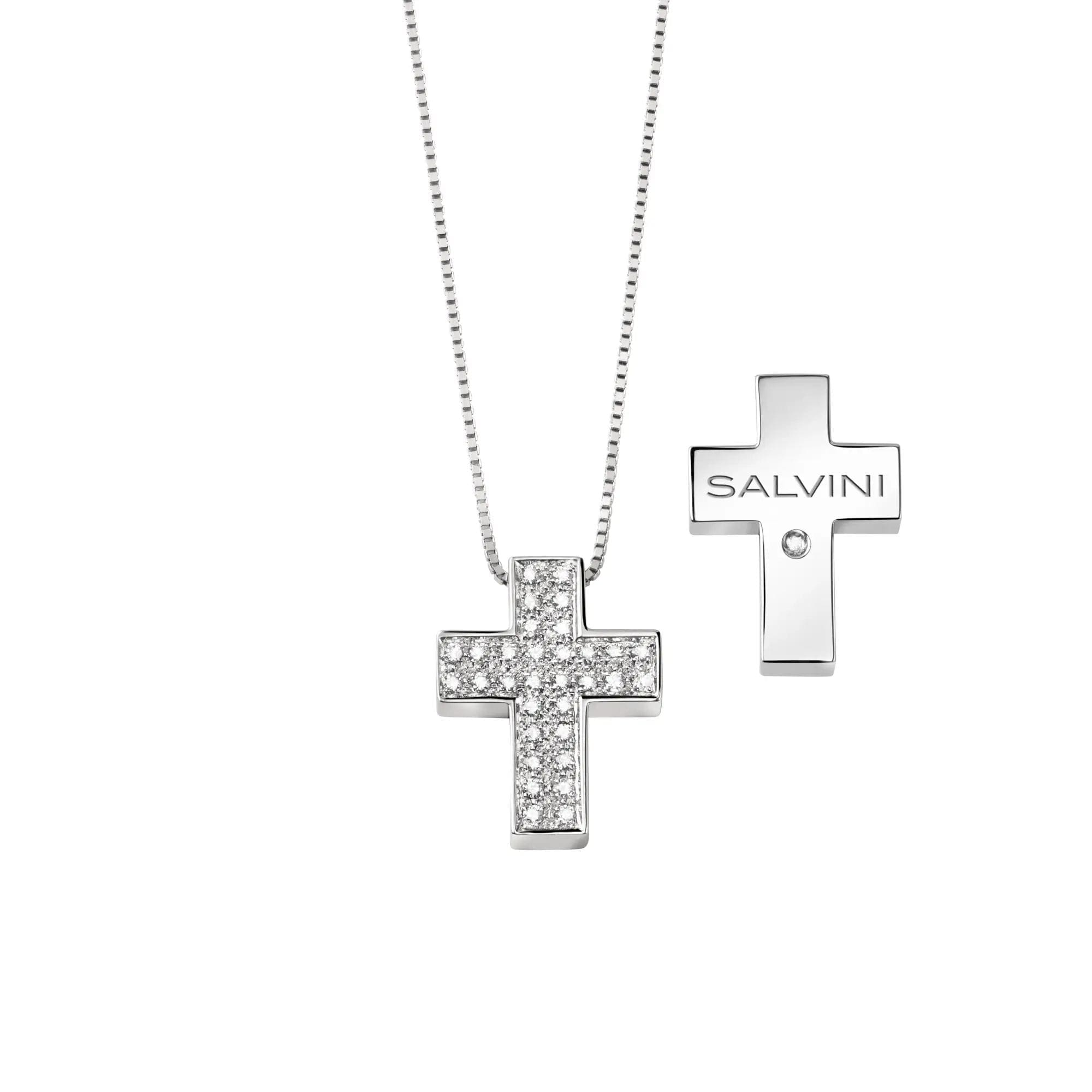 Collana in oro bianco 18 kt con pendente croce della collezione I SEGNI e pavè di diamanti naturali e sul retro logo Salvini con diamante.