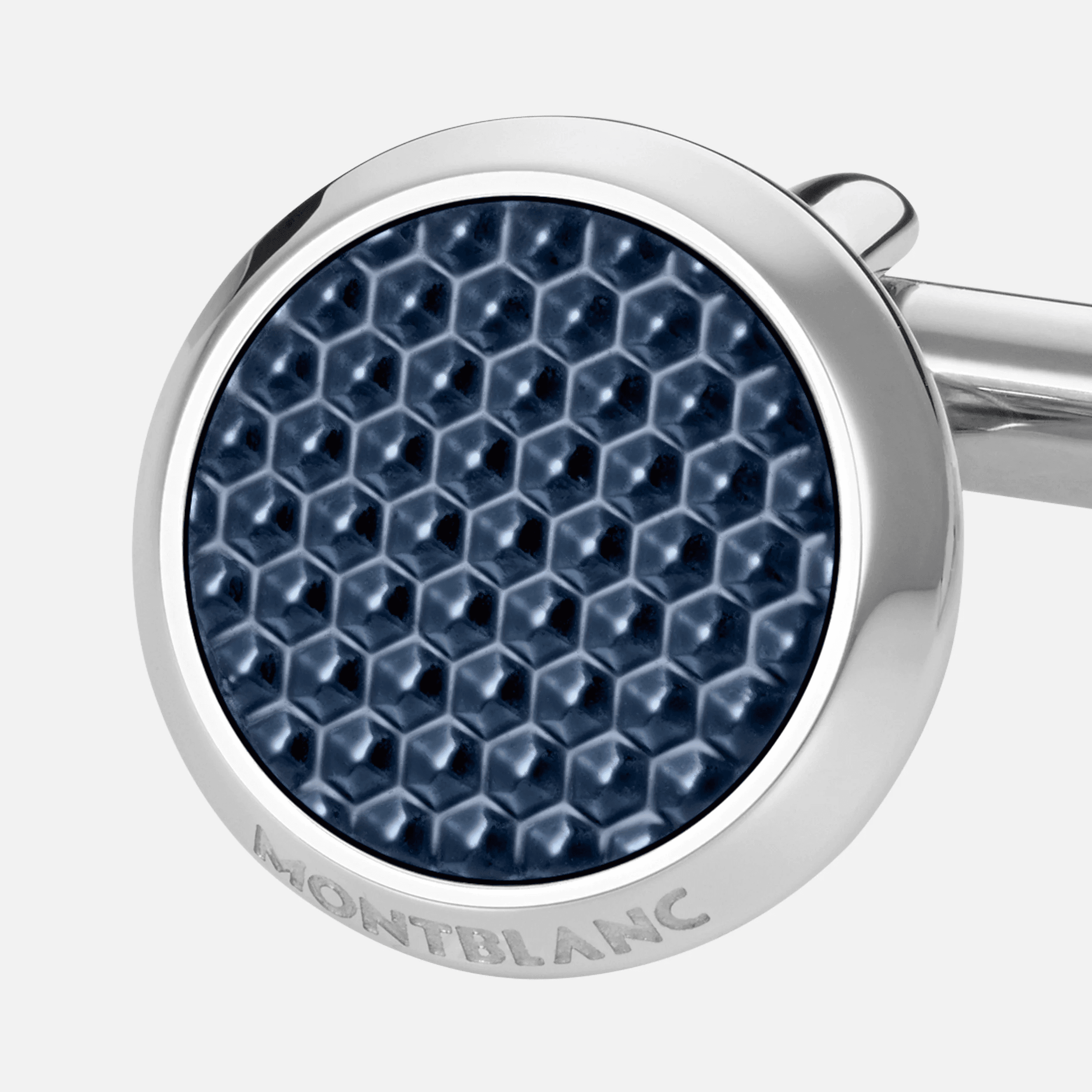 I gemelli Meisterstück celebrano uno stile sobrio ed elegante. L’intramontabile forma rotonda in acciaio pregiato con inserto in lacca blu a motivi esagonali, ispirata allo strumento da scrittura Meisterstück, crea un gioiello dalla forte identità Montblanc.
