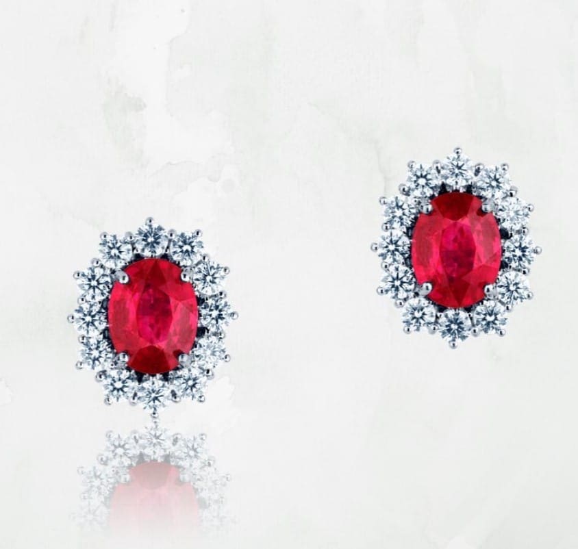 Orecchini in oro bianco 18 kt con diamanti e rubino, disponibili in diverse dimensioni, carature e prezzi.