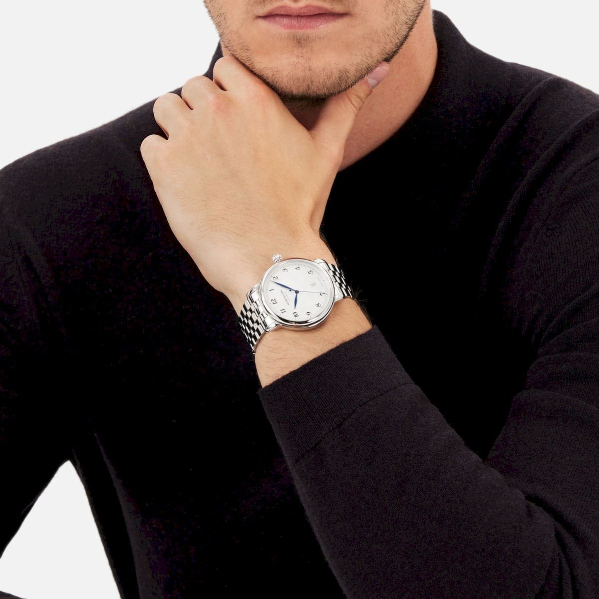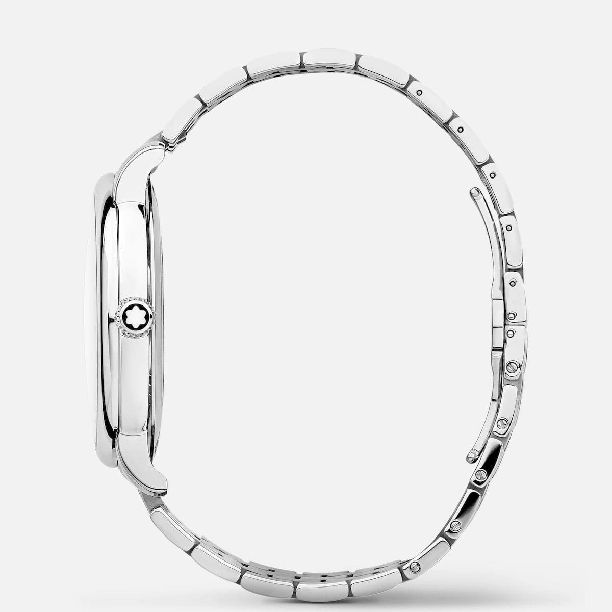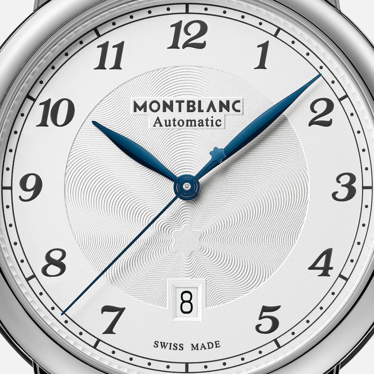 La collezione Montblanc Star Legacy trae ispirazione dal patrimonio Minerva e dai suoi orologi da tasca realizzati fra la fine del XIX secolo e l’inizio del XX. In armonia con i codici di design della linea, il Montblanc Star Legacy Automatic Date presenta un raffinato quadrante bianco-argenté con motivo guilloché a stella variabile Montblanc, numeri arabi, lancette a foglia, un motivo guilloché “filet sauté” e una minuteria “chemin de fer”. Il segnatempo è dotato del calibro automatico MB 24.17 ed è caratterizzato da ore, minuti e secondi centrali e dalla data in una finestrella a ore 6. Presenta una cassa in acciaio pregiato di 42 mm ed è corredato da un bracciale in acciaio pregiato.