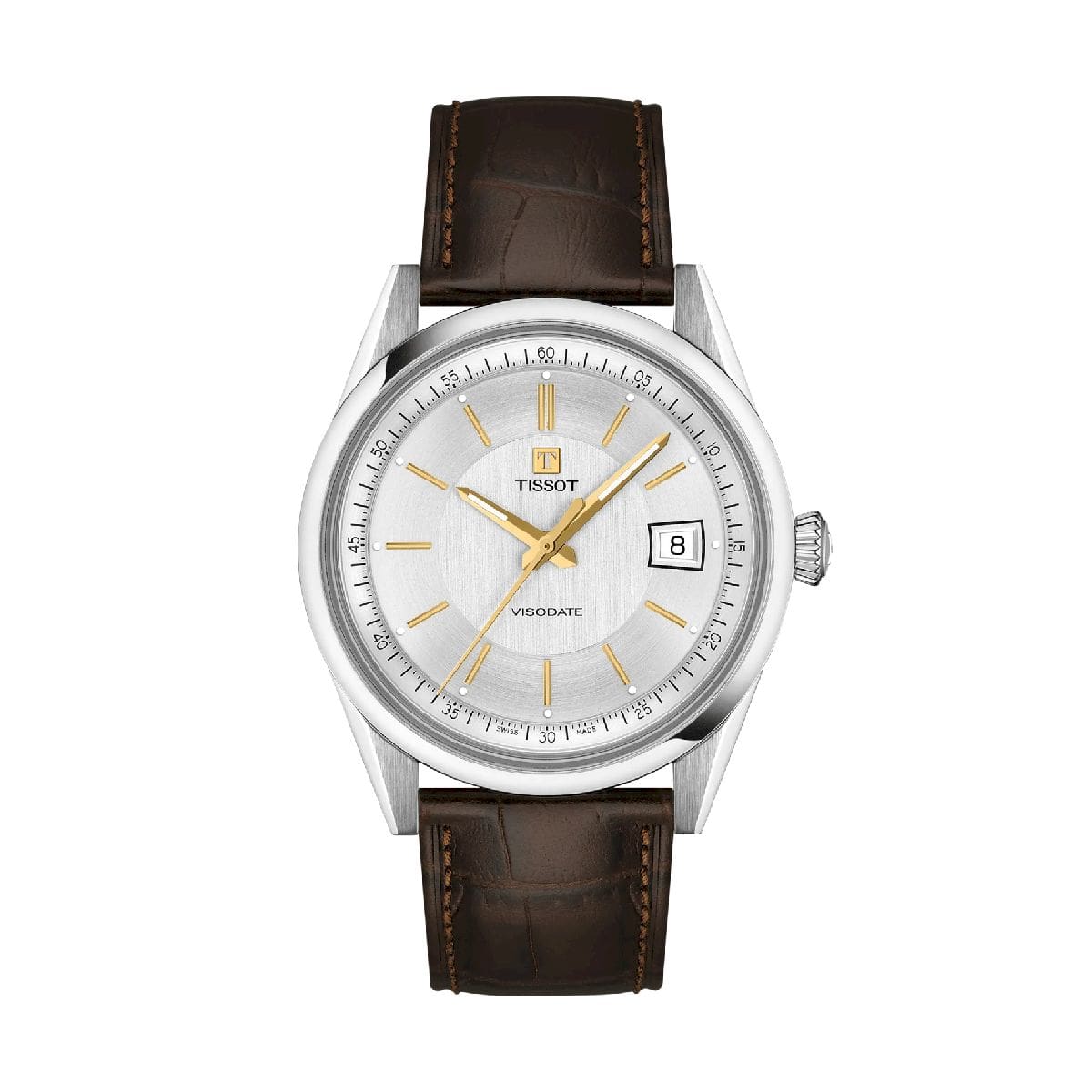 Il Tissot Visodate torna in una nuova versione con cassa da 39 mm. L’orologio si ripresenta come una raffinata continuità della sua tradizione: un segnatempo automatico affidabile e autentico, pensato per accompagnare ogni giorno con il carattere distintivo che lo ha definito nel corso delle generazioni. Il fondello trasparente permette di osservare la meccanica del movimento automatico Powermatic 80, che garantisce fino a 80 ore di riserva di carica. Le lancette Dauphine con rivestimento Super-LumiNova® assicurano una perfetta leggibilità anche con poca luce. Scopri questa versione con quadrante argentato e indici color oro, completata da un cinturino in pelle marrone con motivo effetto coccodrillo e sistema di sgancio rapido, per uno stile classico e raffinato.