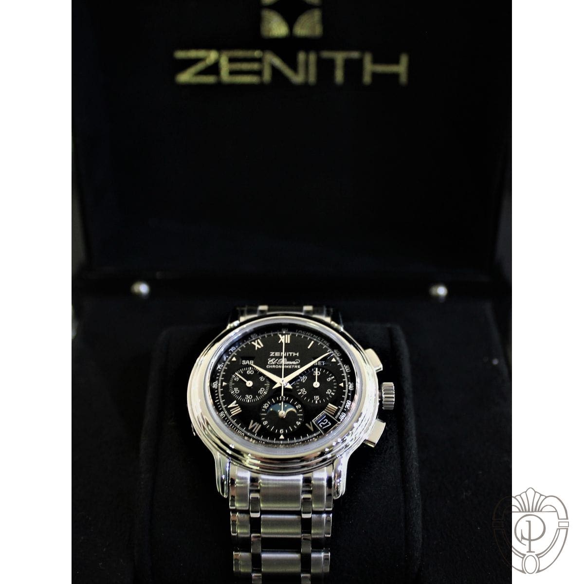 Cronografo Zenith El Primero con calendario completo e fasi lunari, cassa 40mm e bracciale in acciaio.