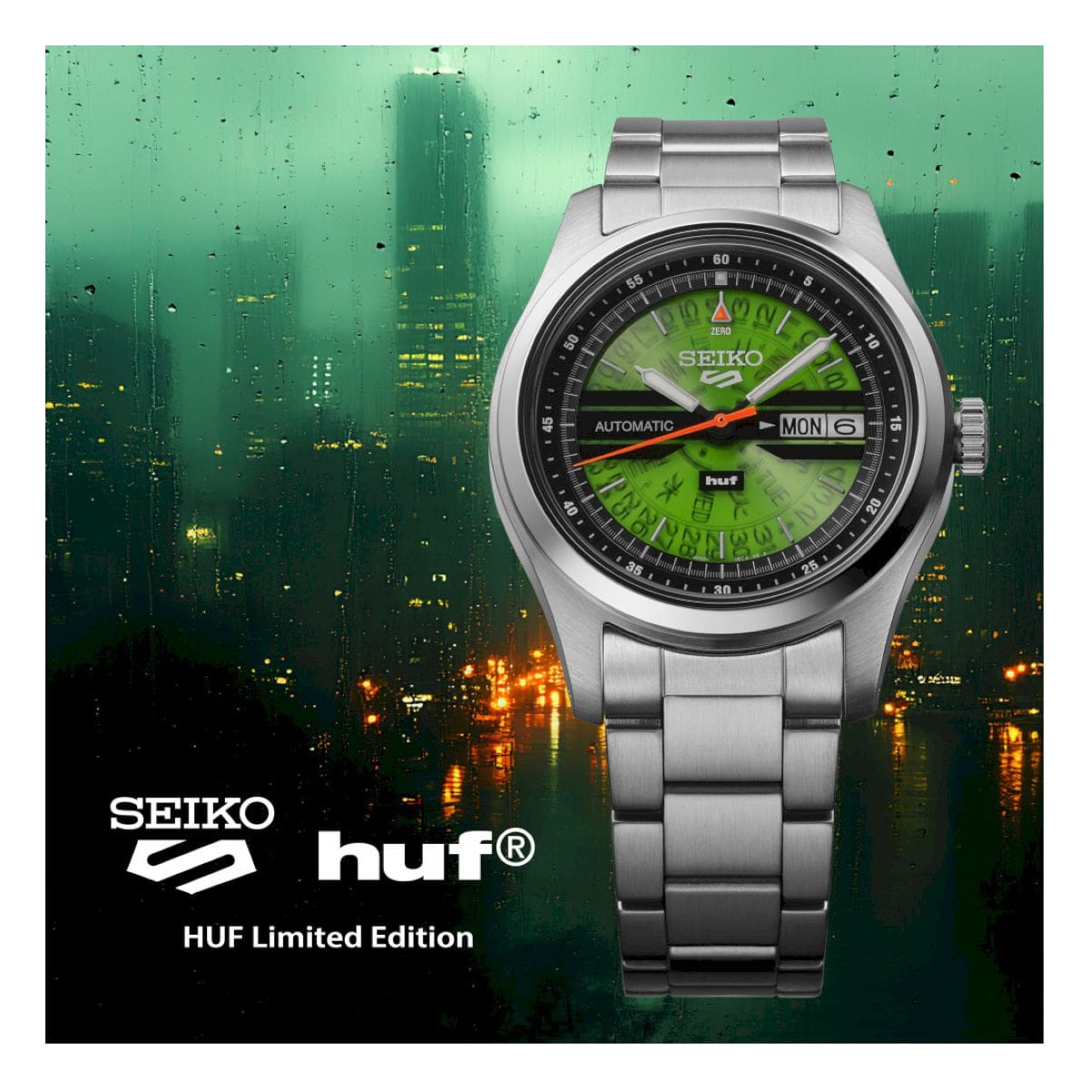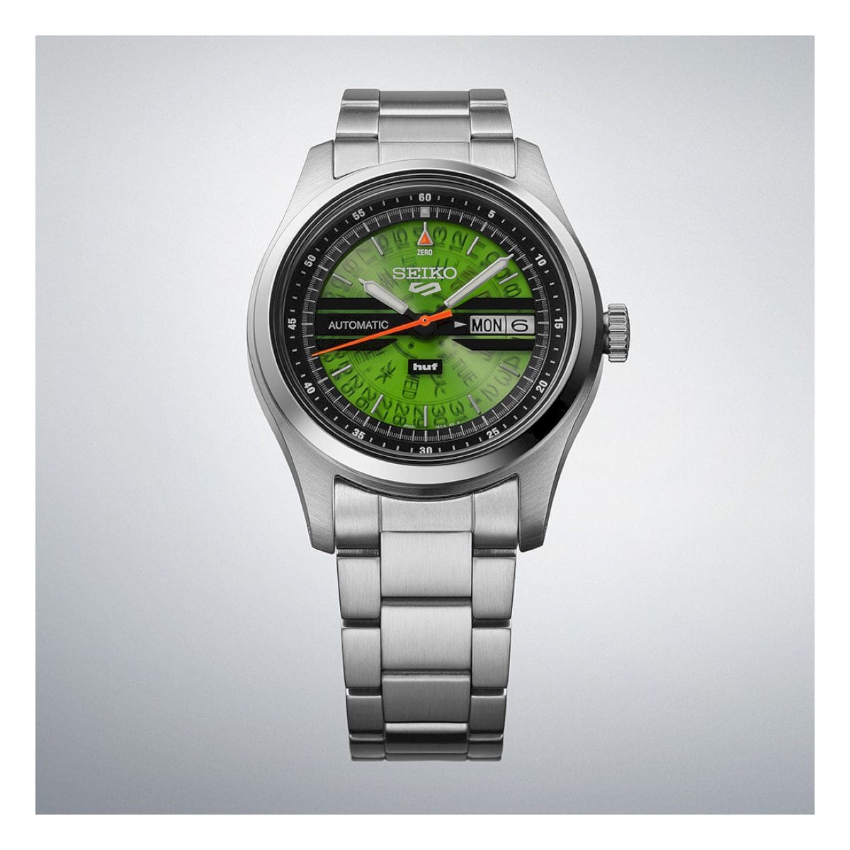 Ispirato a un modello Seiko d’archivio degli anni Settanta, conosciuto come Time Sonar, questo orologio in edizione limitata reinterpreta un’icona del passato attraverso lo stile distintivo di HUF, fondato nel 2002 dallo skateboarder professionista Keith Hufnagel e oggi punto di riferimento nel panorama lifestyle legato allo skateboarding e alla cultura di strada. Basato sulla serie Seiko 5 Sports Field, il segnatempo si distingue per l’esclusivo colore “HUF Green”, simbolo della filosofia del brand, protagonista di un quadrante semi-trasparente che introduce una combinazione cromatica inedita rispetto al modello d’archivio originale, creata appositamente per questa collaborazione, con il logo “huf” posizionato alle ore sei. Il fondello a vista riprende la stessa tonalità verde ed è impreziosito da una grafica ispirata a San Francisco, città in cui HUF è stata fondata, ed è inciso con la dicitura “LIMITED EDITION” e un numero di serie individuale a sottolinearne l’esclusività. L’orologio è presentato in una speciale scatola in acciaio inossidabile e viene accompagnato da un panno originale dedicato alla collaborazione Seiko x HUF, unendo heritage orologiero e spirito street in un’unica creazione di carattere.