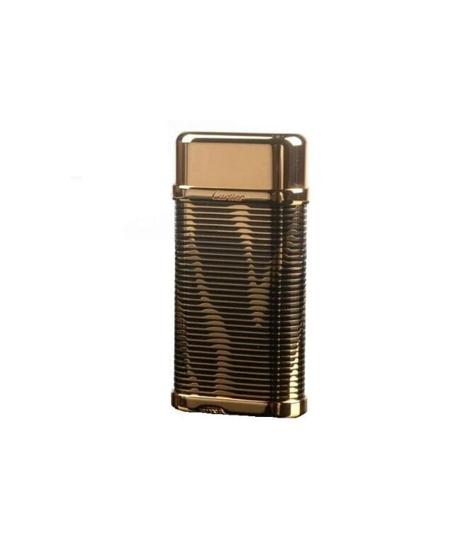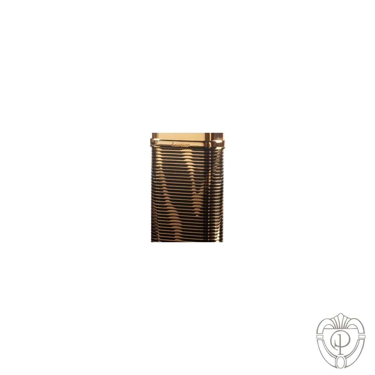 Un accessorio unico come solo Cartier sa creare. L’accendino ha un design ovale e una lavorazione a mille righe dorate. Questa in alcuni punti è laccata nera creando una finitura pitonata.