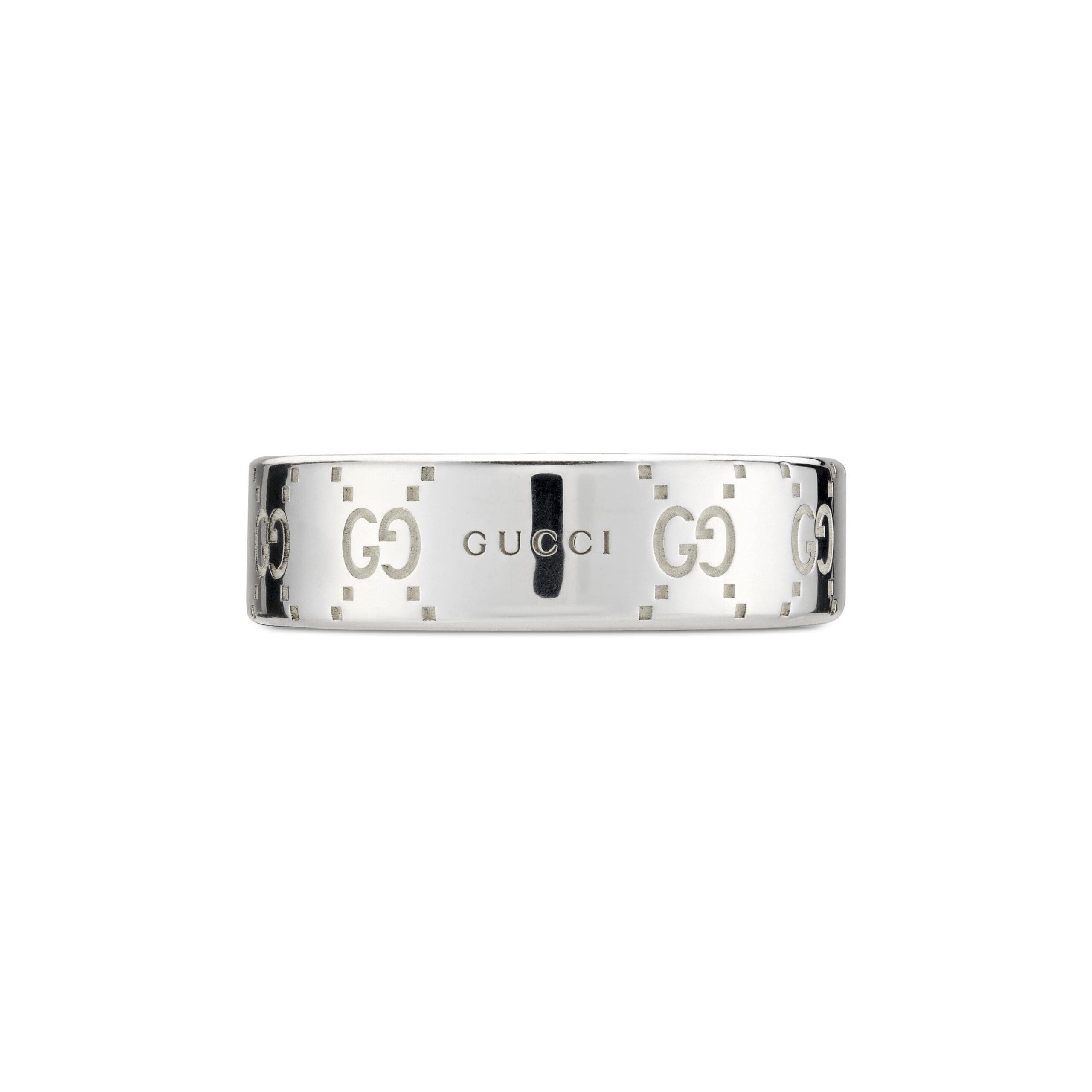 Il motivo GG ritorna e viene riproposto su una selezione di capi e accessori per tutti i giorni dal tocco contemporaneo e facili da indossare. L’incisione dell’emblematico design del logo con puntini decora la base in argento sterling lucido rivestito da una lamina che ne riduce l’ossidazione. Qui il motivo GG adorna e impreziosisce un anello classico a fascia larga.