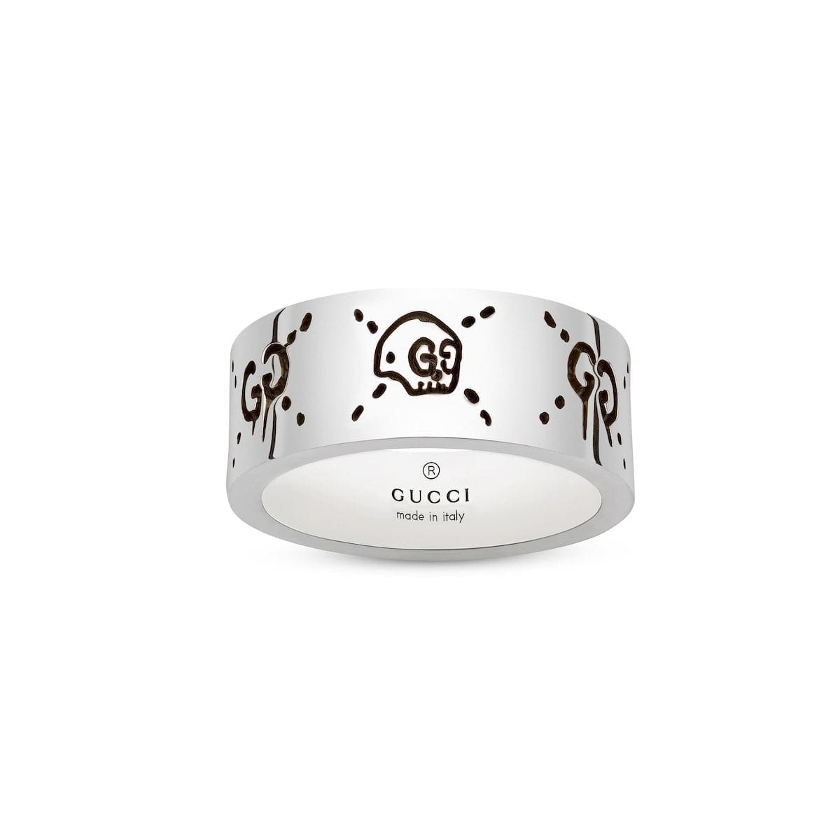 Il caratteristico motivo Gucci Ghost disegnato dall’artista di Brooklyn in stile graffiti è qui inciso su un anello a fascia in argento 925.