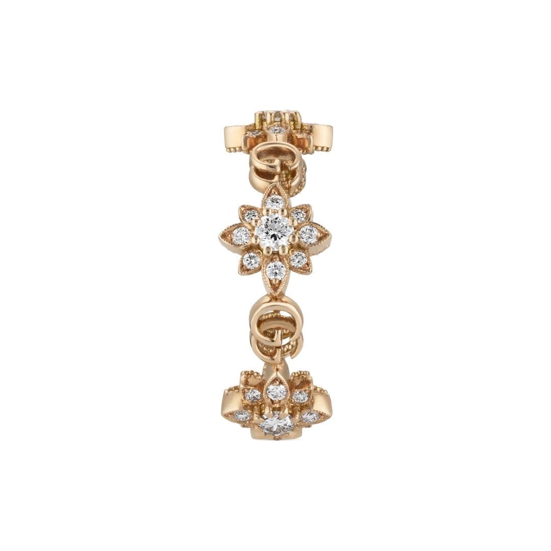 La linea Gucci Flora gioca con le origini del suo nome per presentare una selezione di pezzi di ispirazione botanica. Dettagli floreali in oro rosa arricchiti con diamanti compaiono accanto all’emblematico logo con Doppia G, definendo questo anello con un tocco romantico.