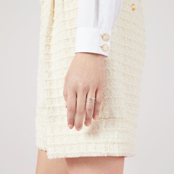 Ispirata al tema del romanticismo, la collezione Gucci Link to Love esplora i simboli dell’amore in chiave contemporanea. La collezione combina diverse tonalità di oro e un mix di finiture, sfumando i confini tra maschile e femminile. Grazie al loro design impilabile, ogni modello è creato per sperimentare nuovi modi d’indossarlo ed esprimere la propria individualità. Questo anello in oro bianco 18 carati con borchie ha un meccanismo impilabile.