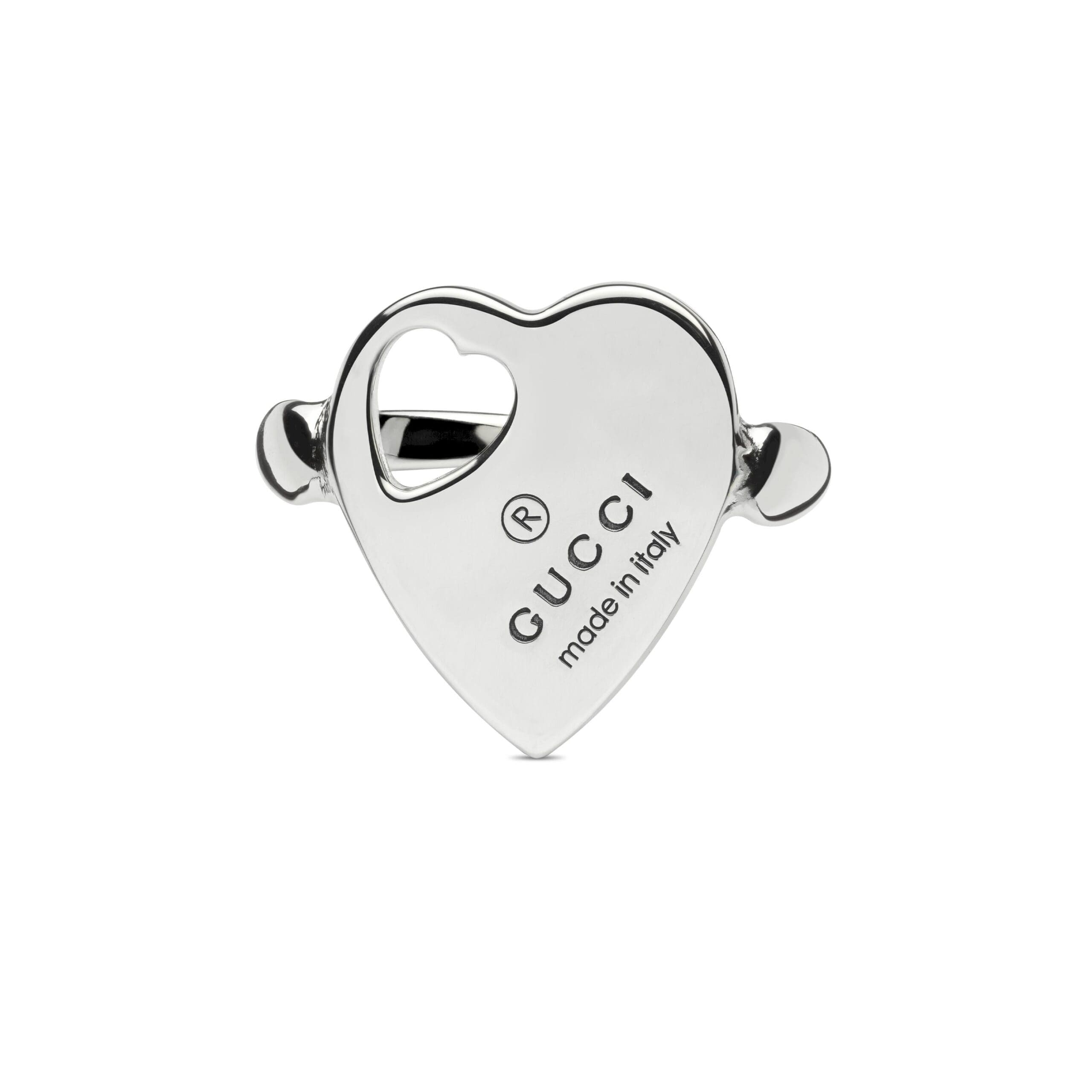 La linea Gucci Trademark unisce motivi e dettagli esagonali con il nome della Maison. Dal cuore cut-out al lucchetto, simboli divertenti continuano a caratterizzare una selezione di anelli, collane, bracciali e orecchini per la collezione Pre-Fall 2024. Questo anello presenta il caratteristico cuore con un dettaglio cut-out, anch’esso a forma di cuore.