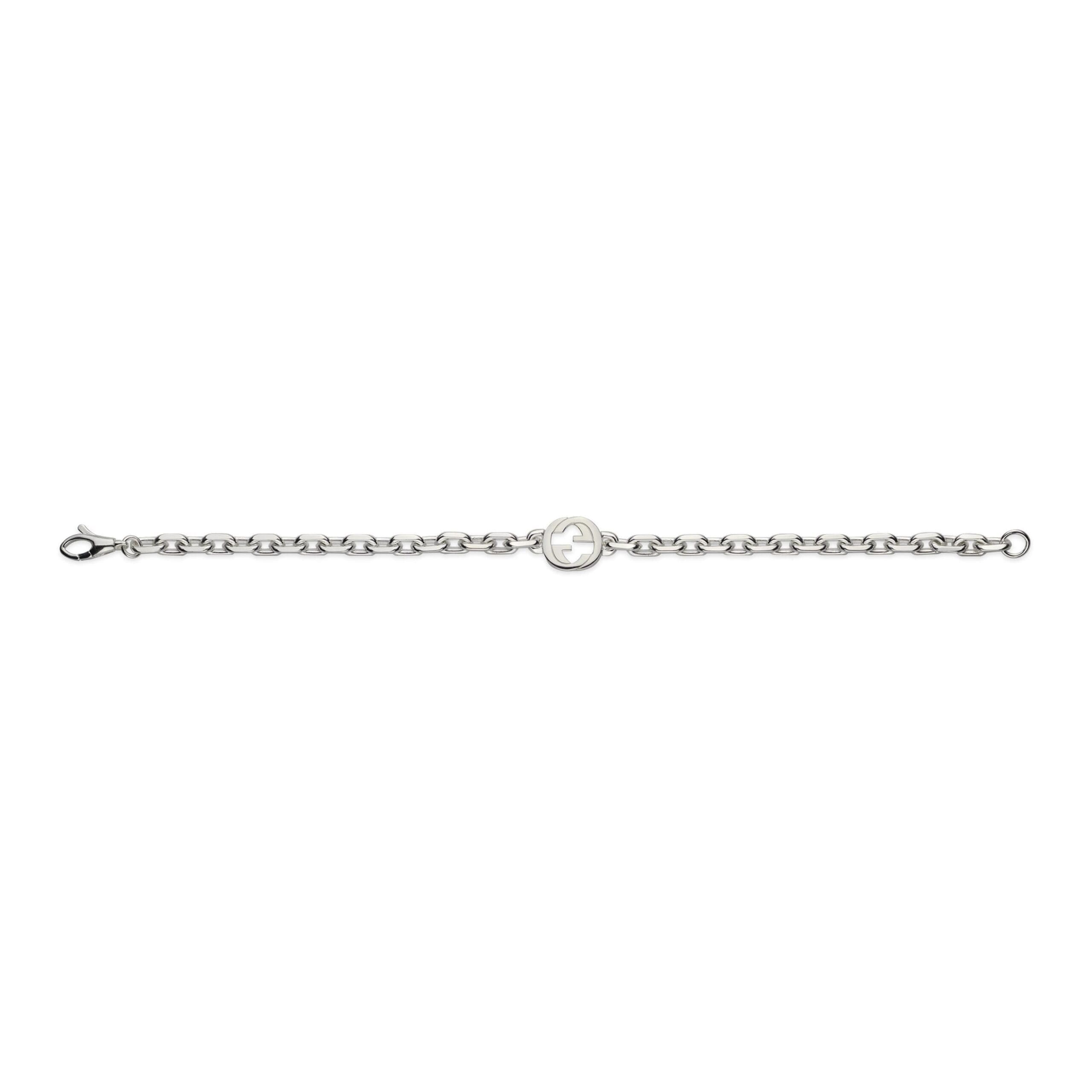 Ispirato allo spirito estivo e ai beach club della costa italiana, questo articolo fa parte della linea Gucci Lido. Il motivo Incrocio GG viene reinterpretato in chiave contemporanea su nuovi anelli a doppia fascia e spessi orecchini a cerchio. Morbidi bracciali e collane a catena sono impreziositi dal motivo sotto forma di dettaglio con logo. Questo bracciale, con chiusura a moschettone, sfoggia il dettaglio in versione cut-out.