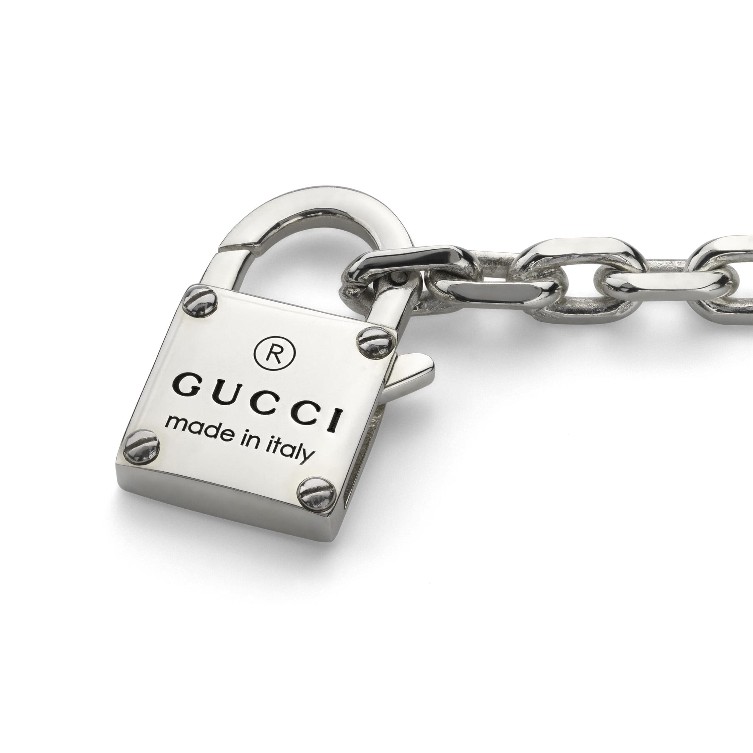 La linea Gucci Trademark unisce motivi e dettagli a bullone esagonali con il nome della Maison. Dal cuore cut-out al lucchetto, simboli divertenti continuano a caratterizzare una selezione di anelli, collane, bracciali e orecchini per la collezione Pre-Fall 2024. Il lucchetto con incisione Gucci Trademark definisce questo bracciale a catena in argento sterling.