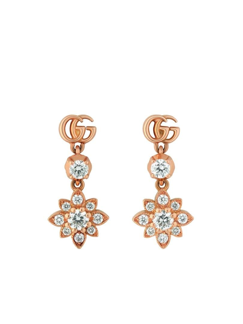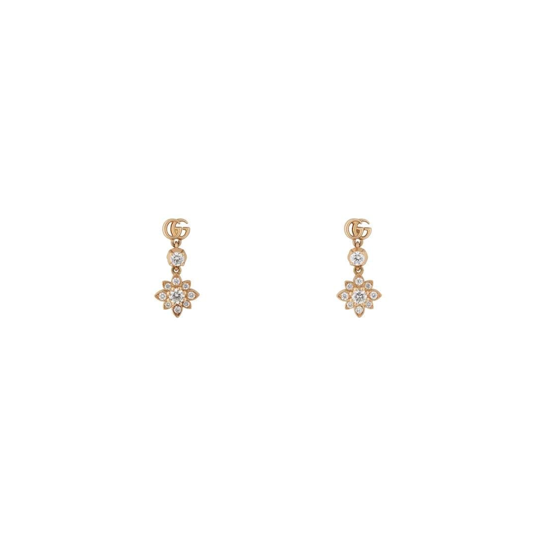 La linea Gucci Flora gioca con le origini del suo nome per presentare una selezione di pezzi di ispirazione botanica. Dettagli floreali in oro rosa arricchiti con diamanti compaiono accanto all’emblematico logo con Doppia G, definendo questo paio di orecchini con un tocco romantico.